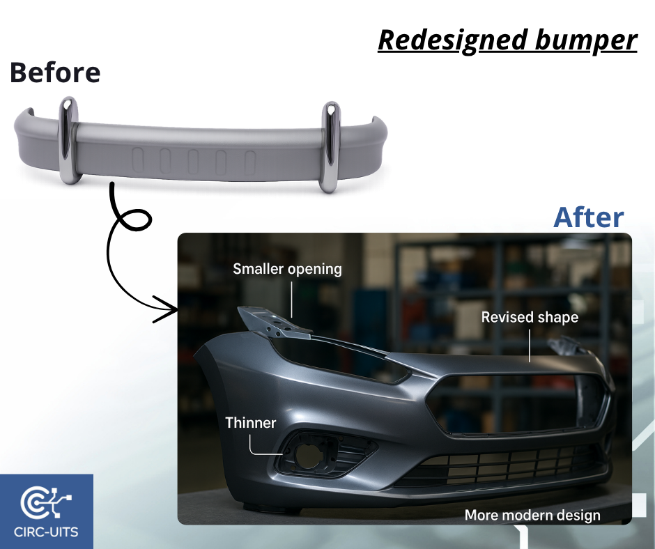 The example above clearly demonstrates how product redesign can enhance manufacturing efficiency and support sustainability goals. In this case, engineers redesigned a car bumper by introducing a thinner structure, smaller openings, and a more modern shape, resulting not only in aesthetic improvements but also in material savings and better performance.